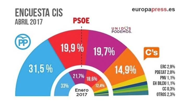 El Barómetro de Opinión del Centro de Investigaciones Sociológicas (CIS) del mes de abril, el segundo con intención de voto desde la investidura de Mariano Rajoy, mantiene al PP como primera fuerza con un respaldo electoral del 31,5%, un punto y medio menos que en las generales, mientras que el PSOE recupera la segunda plaza superando a Unidos Podemos y Ciudadanos gana casi tres puntos respecto a su resultado de junio de 2016.